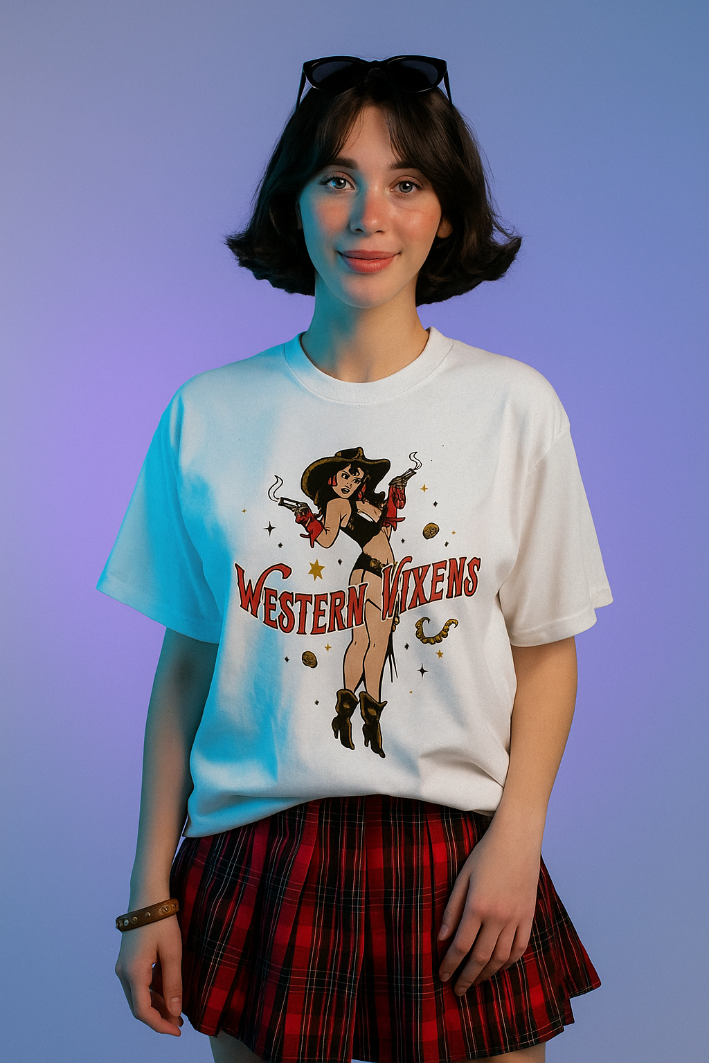 The Cowgirl & Pinup Girl 60s Collection captures the bold, free-spirited charm of vintage America. Each T-shirt celebrates the confident allure of retro pinup girls and the adventurous soul of wild west cowgirls — featuring iconic imagery like curled hair, tied-up blouses, short skirts, and wide-brimmed hats.